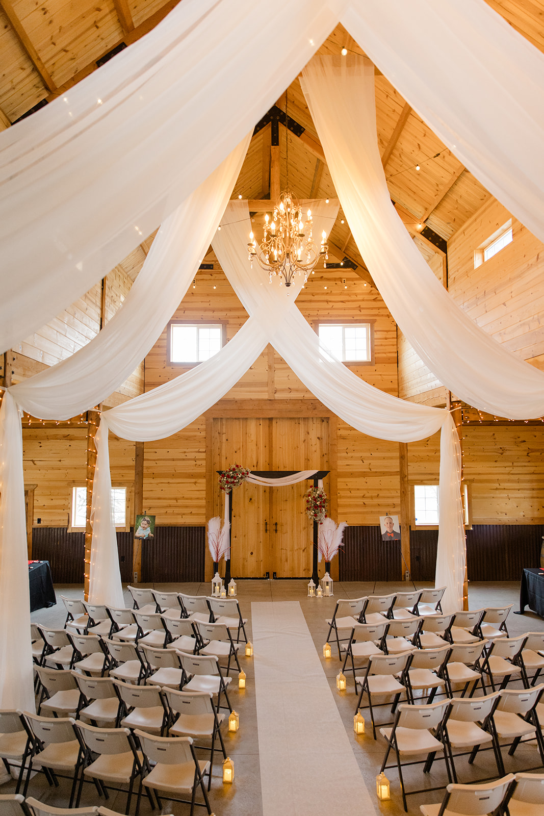 Inside, the reception and ceremony space is equally stunning. The dramatic light fixtures add so much character and depth to photos, especially in the evening when the glow creates a warm, romantic atmosphere. Whether you’re planning an indoor ceremony or a cozy reception, the space photographs beautifully from every angle.
